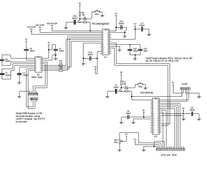 1.3 At the same time, the PIC24FJ also outputs via a second UART connection to a PIC16F1939. The PIC16F receives the serial communication and outputs what has been received by it to an LCD screen. The PIC16F EUART module only requires two wires, and uses interrupts to handle its internal buffer. All of these communications are at a basic level, but functional.